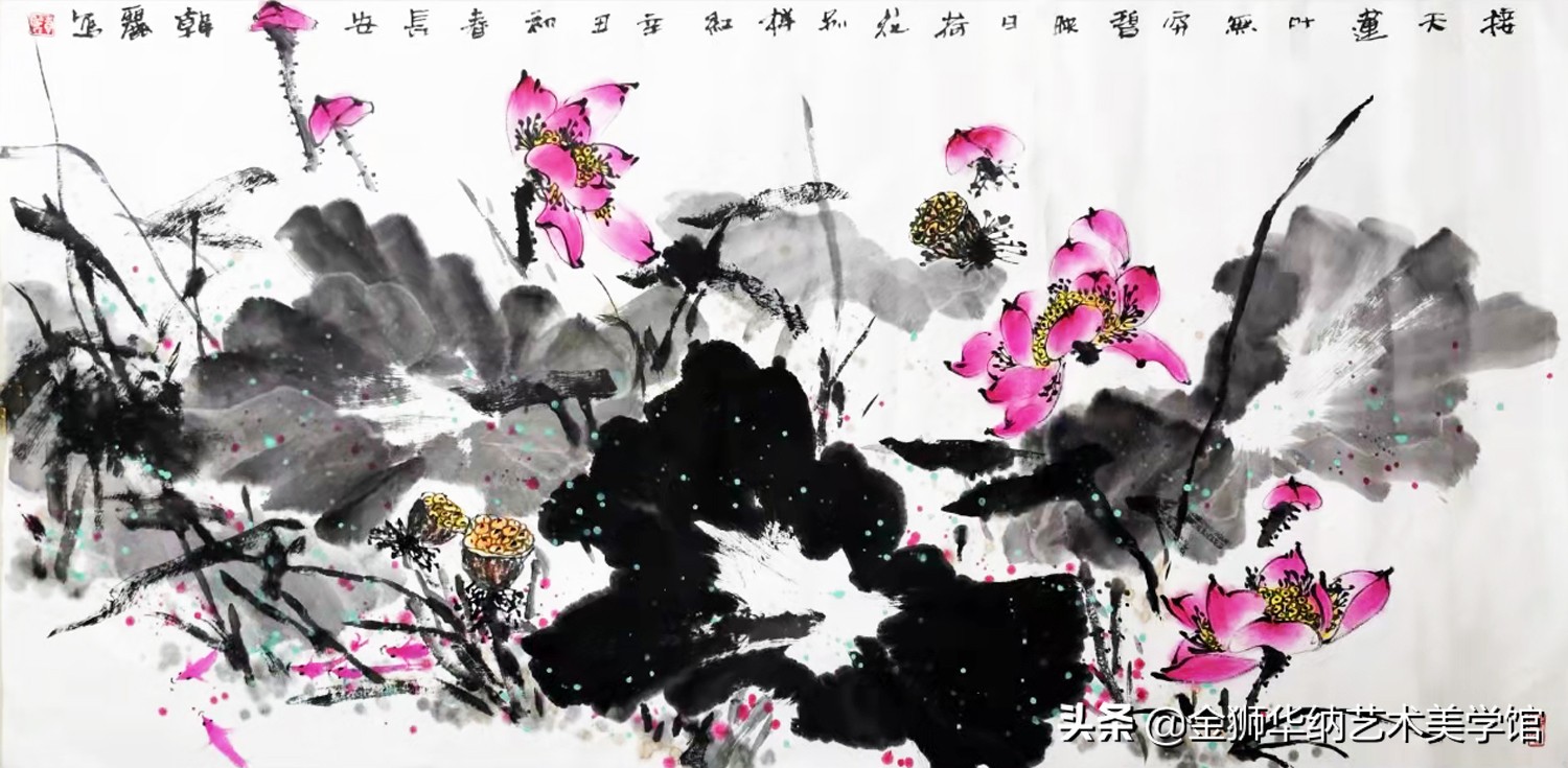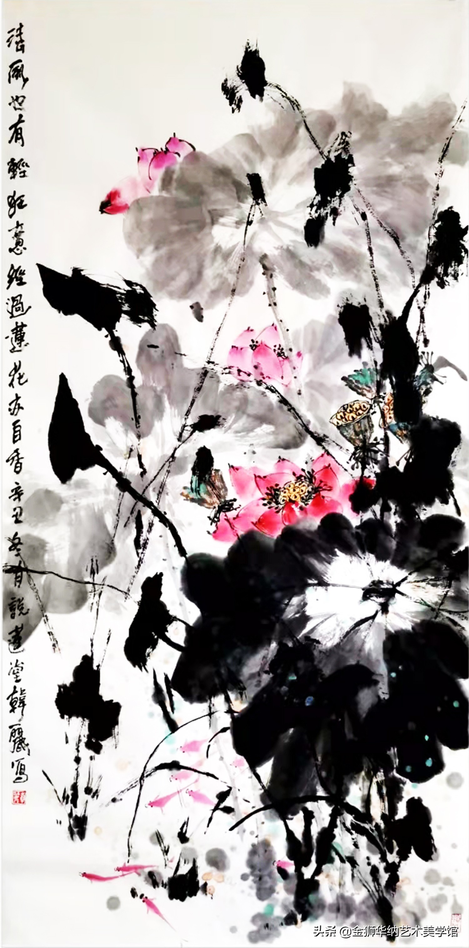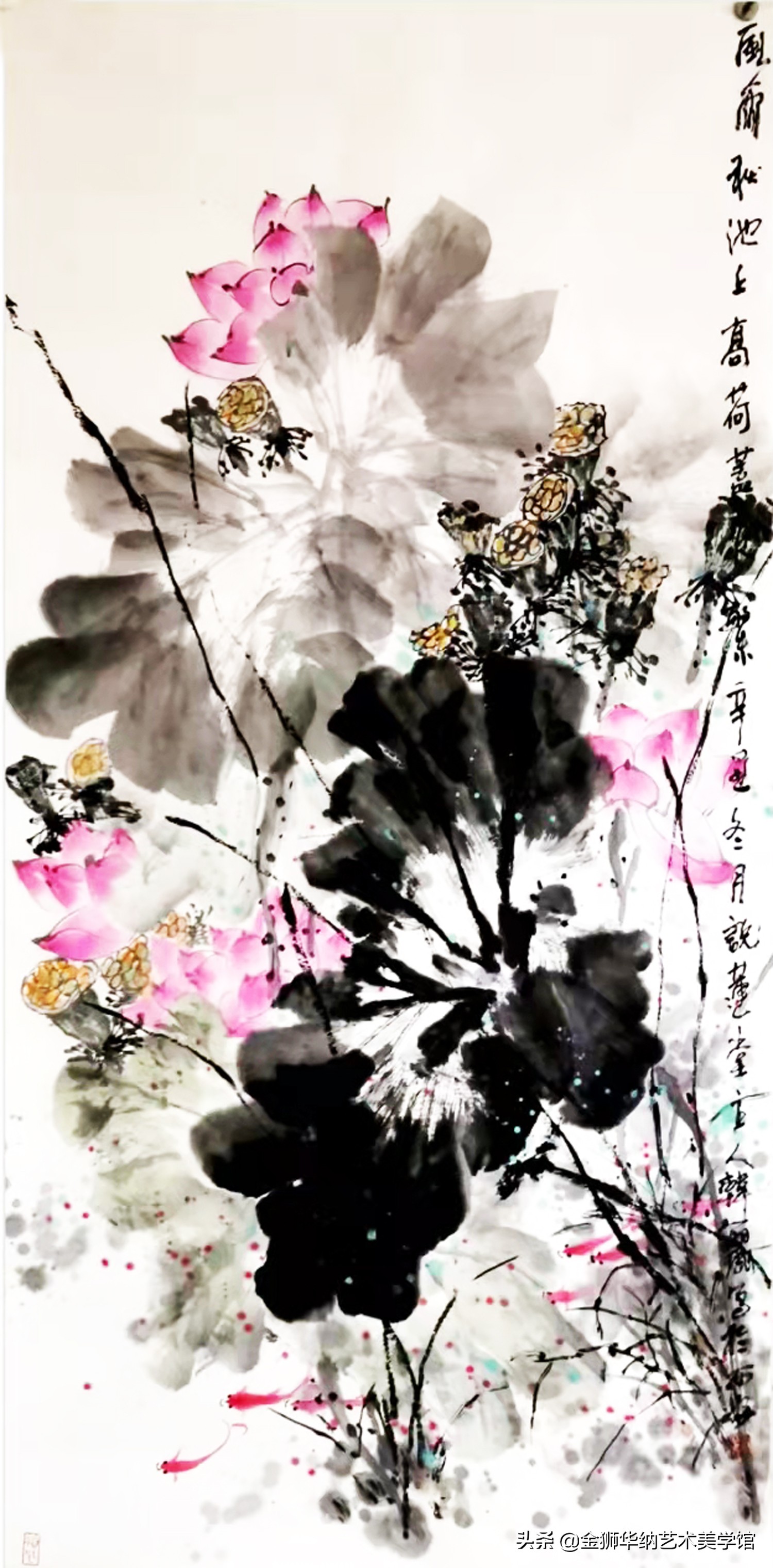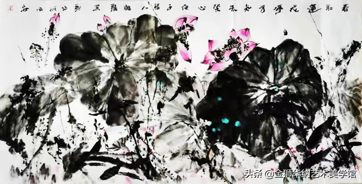 一支饱蘸浓墨的大笔洒向宣纸,画成浑厚荷叶,在斑驳的墨色中,让观者体会着生活的酸甜苦辣。不经意的几笔皴擦点染了一塘池水,清澈荡漾,无私无欲,洁净的使人流连忘返。秀一笔淡淡曙红描绘的荷花,让它高洁的志向,在不经意间飘向远方去净化大众的心灵。