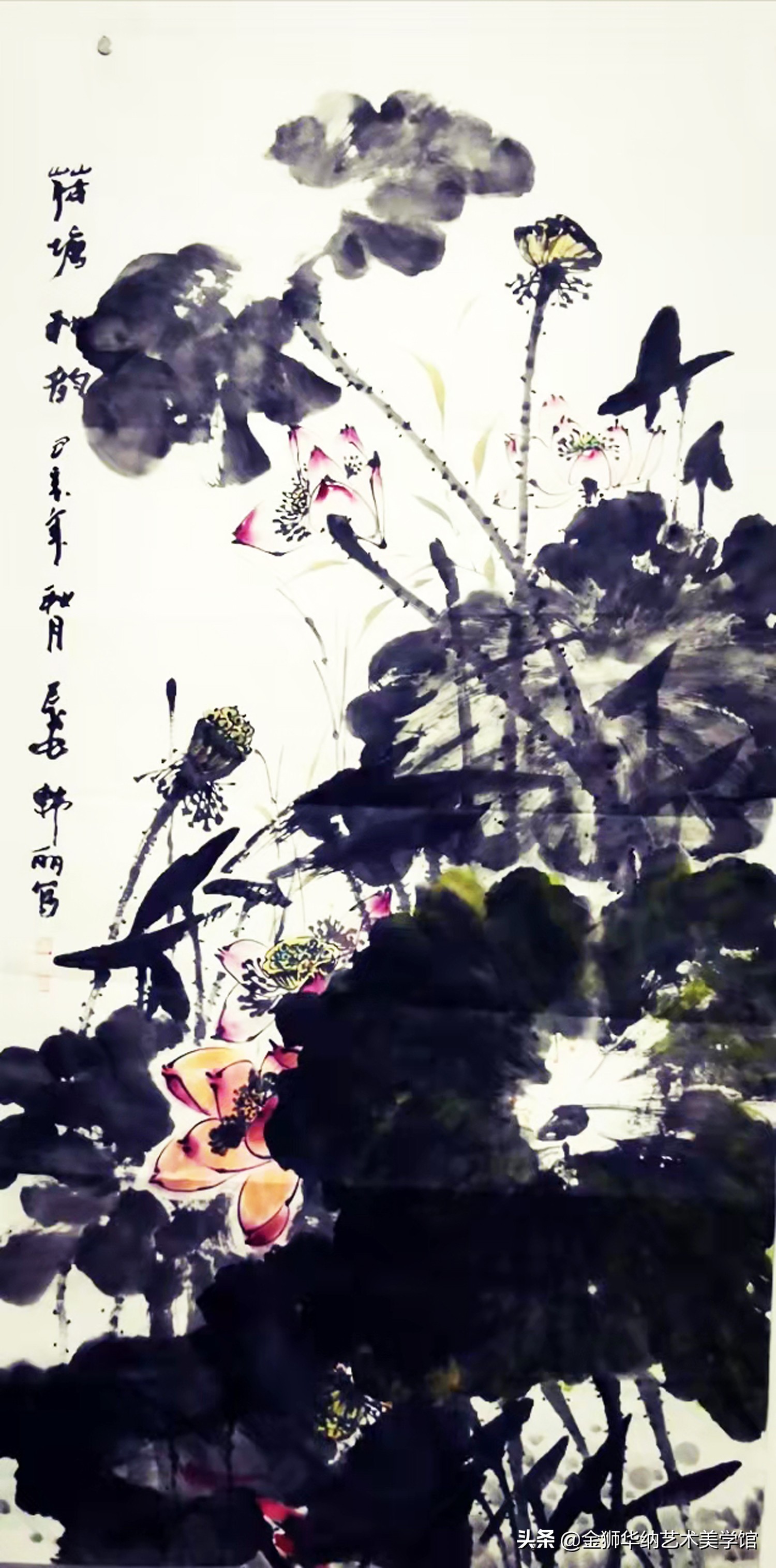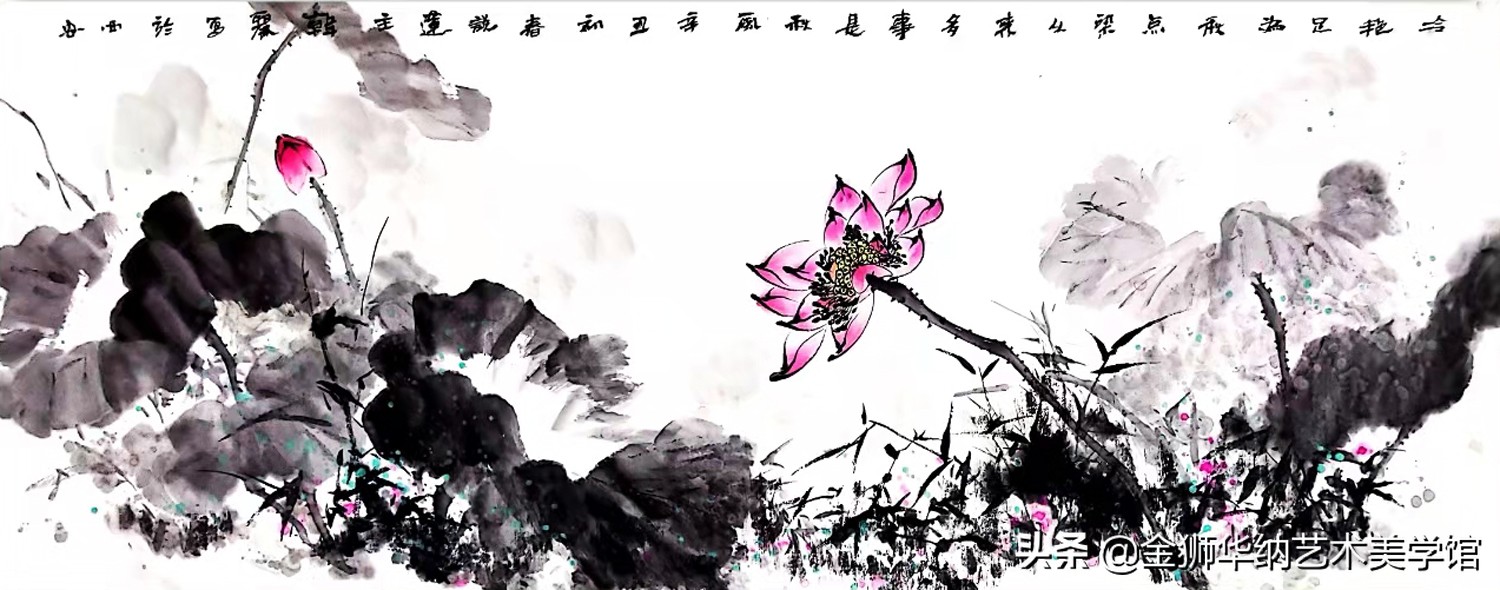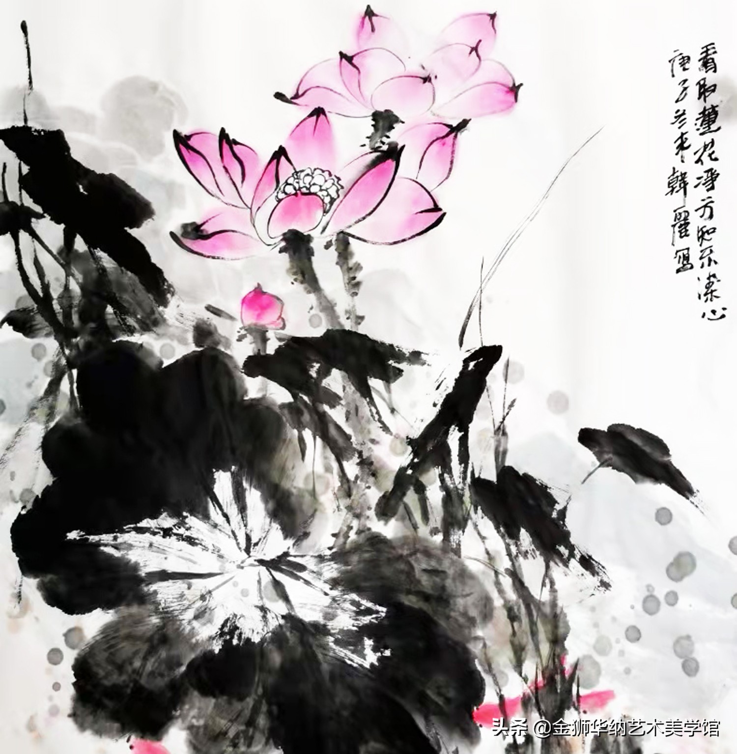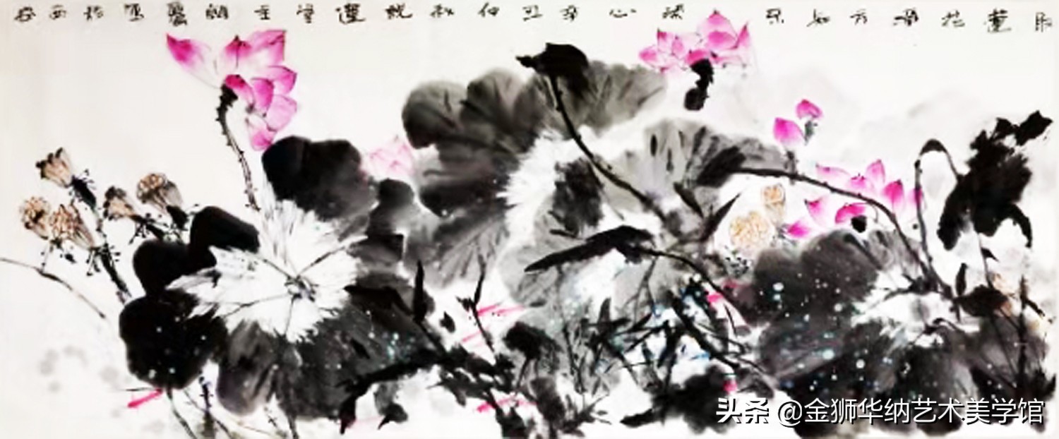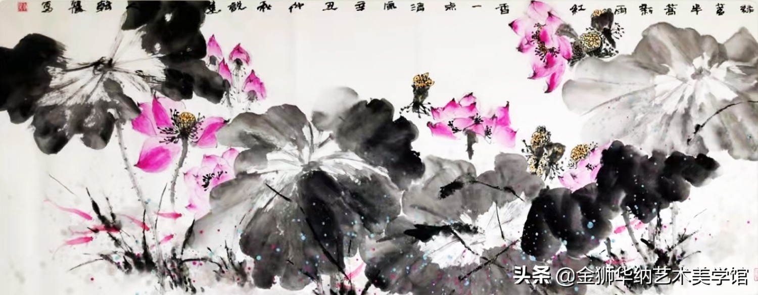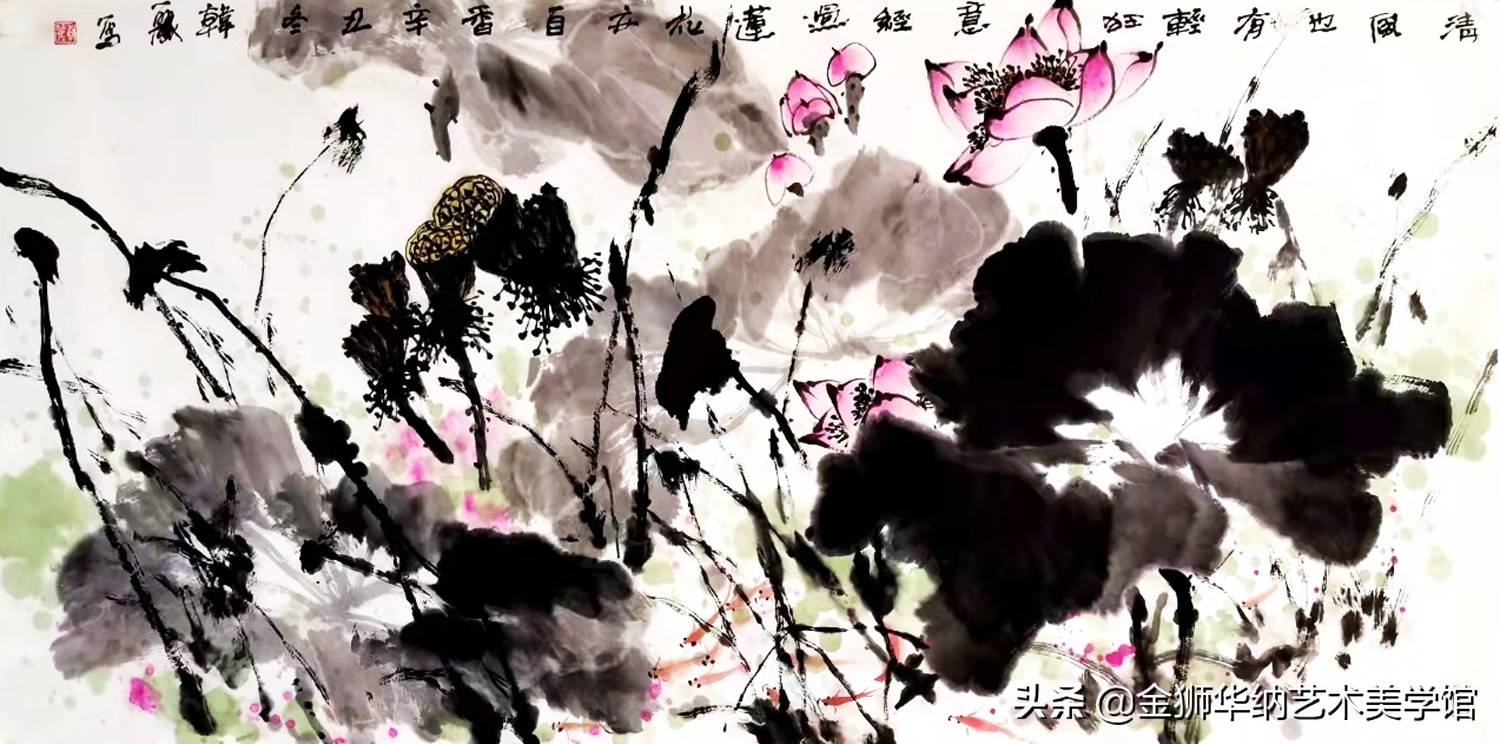 一支饱蘸浓墨的大笔洒向宣纸,画成浑厚荷叶,在斑驳的墨色中,让观者体会着生活的酸甜苦辣。不经意的几笔皴擦点染了一塘池水,清澈荡漾,无私无欲,洁净的使人流连忘返。秀一笔淡淡曙红描绘的荷花,让它高洁的志向,在不经意间飘向远方去净化大众的心灵。
