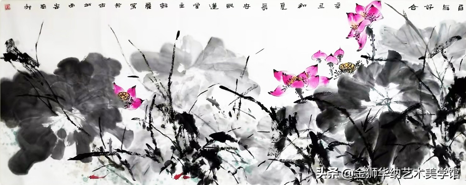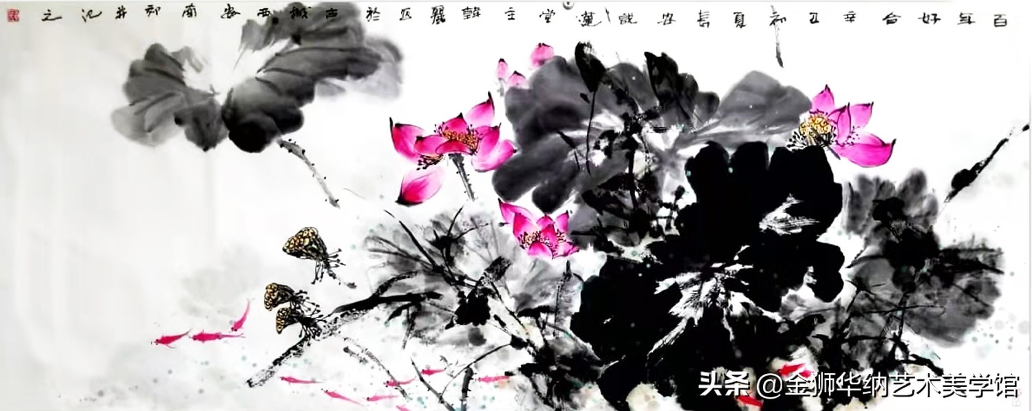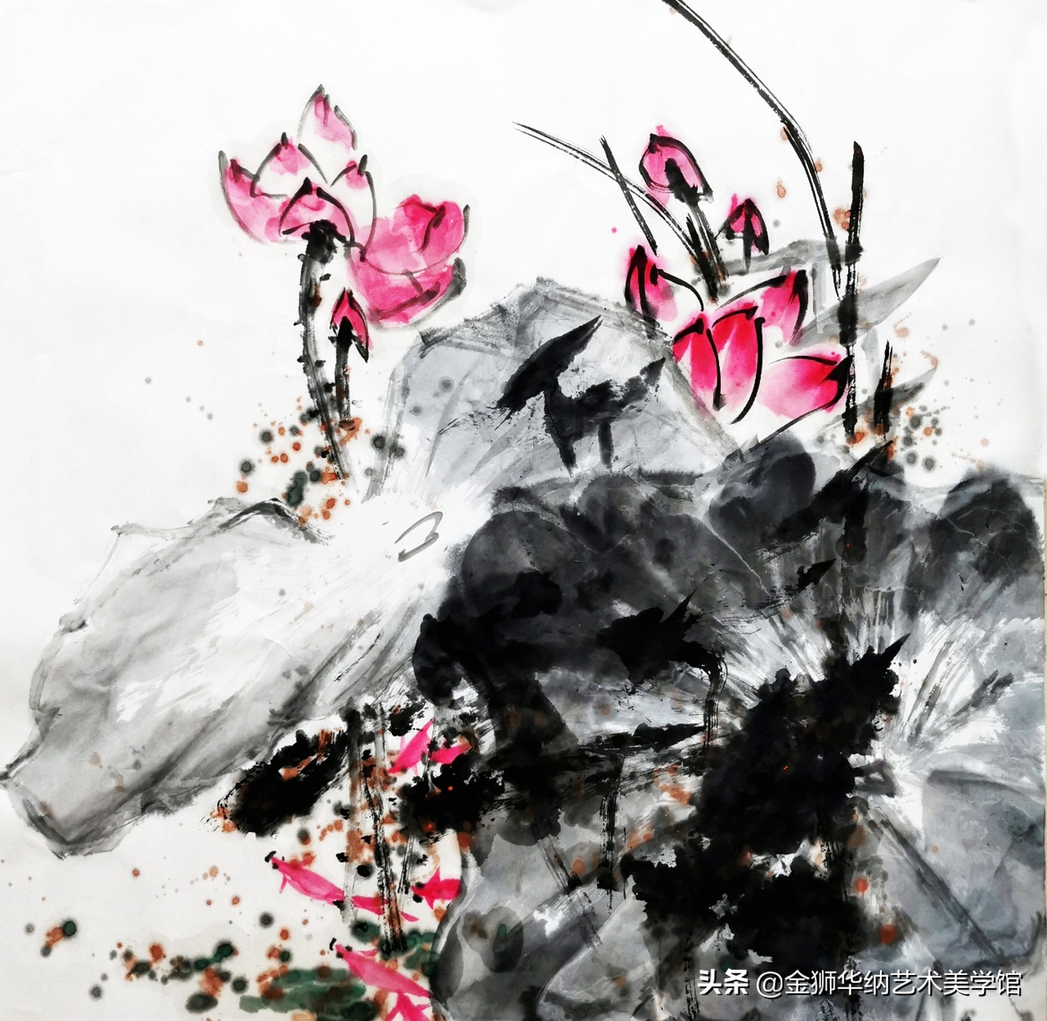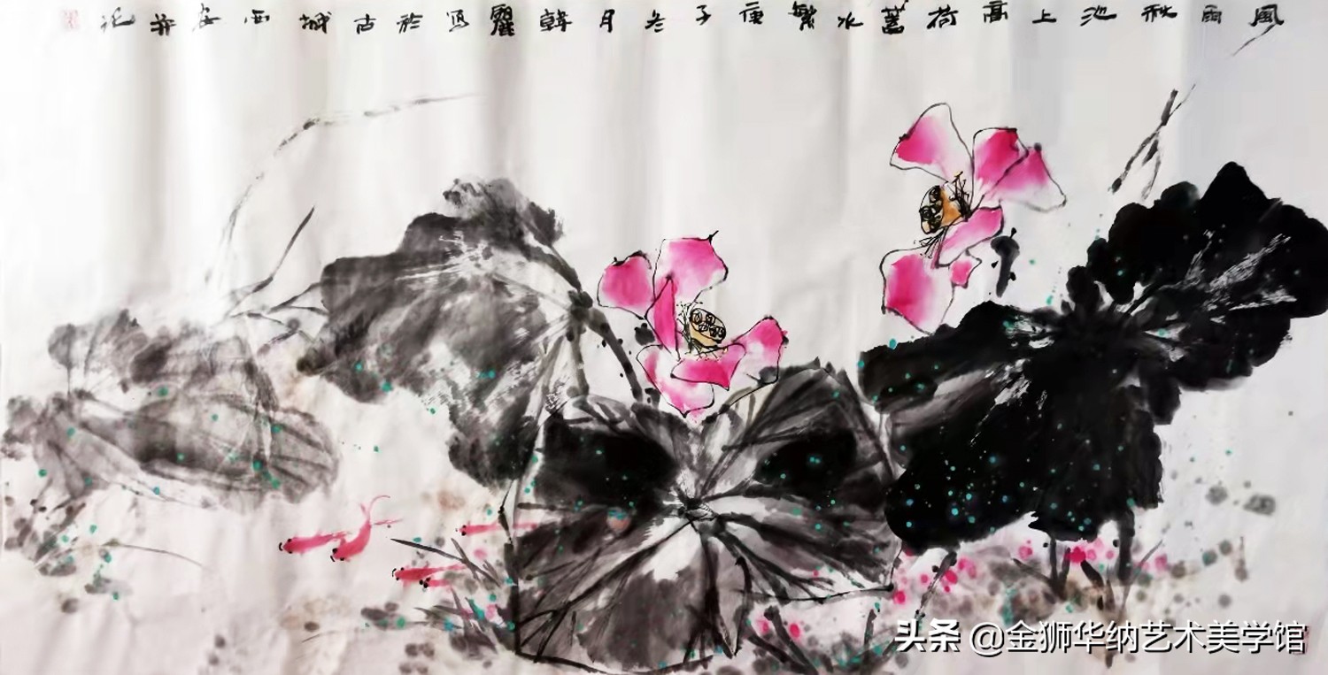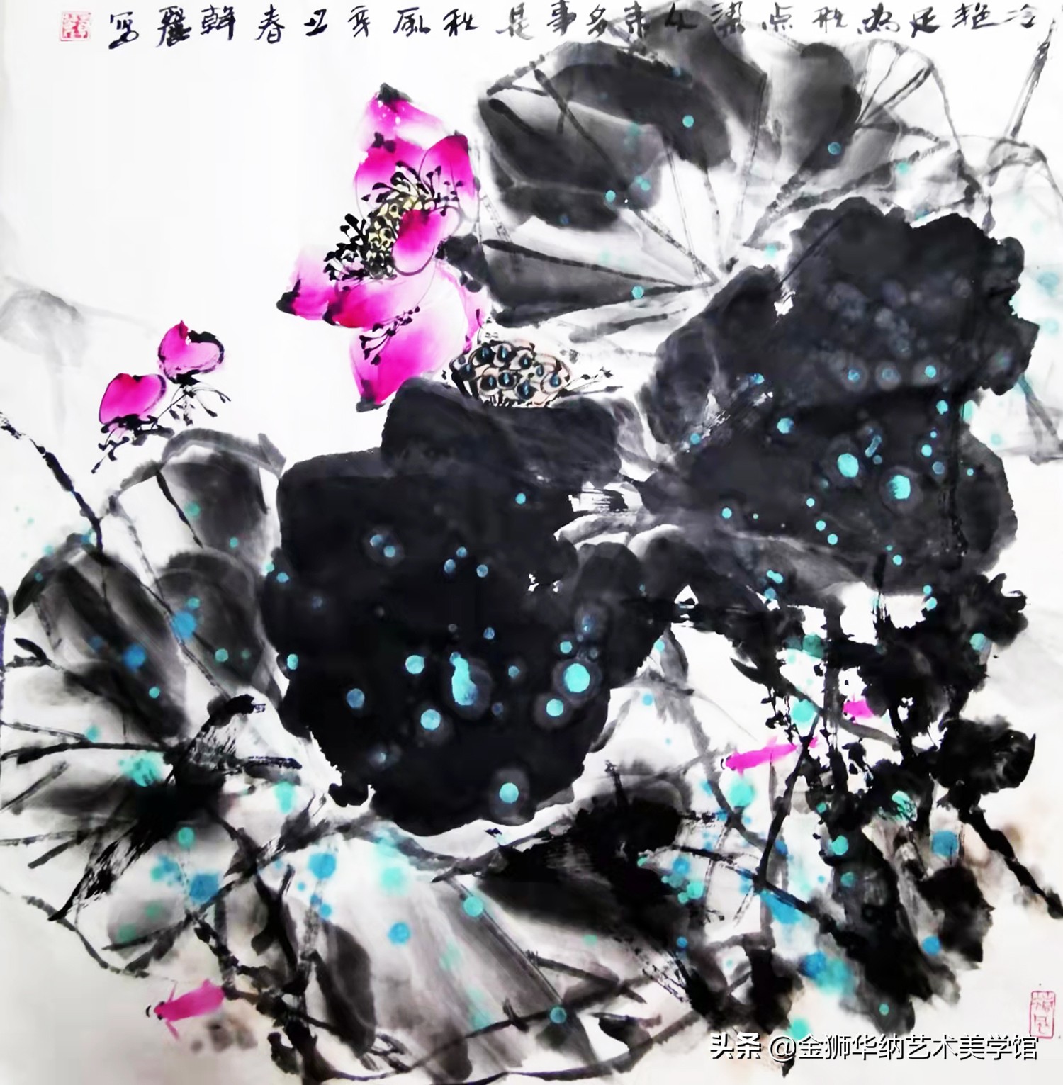 一支饱蘸浓墨的大笔洒向宣纸,画成浑厚荷叶,在斑驳的墨色中,让观者体会着生活的酸甜苦辣。不经意的几笔皴擦点染了一塘池水,清澈荡漾,无私无欲,洁净的使人流连忘返。秀一笔淡淡曙红描绘的荷花,让它高洁的志向,在不经意间飘向远方去净化大众的心灵。