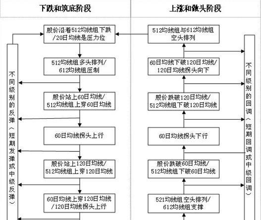 1、下跌和筑底阶段指512均线组和612均线组从空头排列,经过逐浪下跌,多次反弹,多次探底,直到512均线组有效向上突破612均线组并形成多头排列的过程。