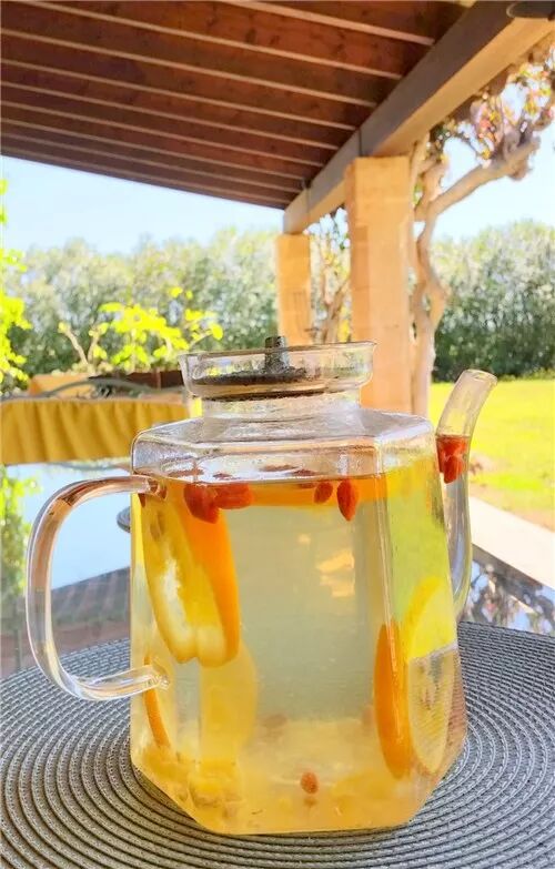 她带我们参观了庄园的四周各种房间,以及果园里很多我们认得出和认不出的果树,并为我们泡上庄园里采摘的柠檬加橘子,切片,加上中国的枸杞子健康饮品,红,黄,橘三色天然色彩的水果片,立在水中轻轻荡漾,煞是诱人。坐在宽大气派的长桌边,透过客厅整面墙大的落地玻璃窗门,欣赏着庄园里的草坪,鲜花,果树,游泳池,远处的山景,蓝天白云,马上理解了常有人一来这里就不想走了…
