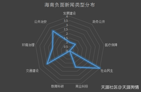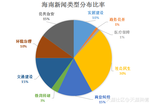 天涯舆情中心通过对海南网站和全国主要新闻网站海南地方频道的全部内容进行统计和分类,该时段内,社会民生、交通建设、商业纠纷和公共治安类新闻,所占比例较为明显。其中社会民生和公共治安类新闻上升明显。