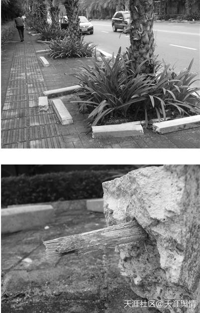 那大镇北吉二路道路改造,挖出来的树池石断裂面可见竹条,里面没有钢筋,市民认为这是“豆腐渣”工程。附近居民对此颇有微辞:才铺了3年多的树池石,现在要全部拆掉,换成大理石,真是劳民伤财!儋州有关部门回复称,对这类树池石没有质量要求。施工方代表王某解释:这些树池石是使用素混水泥,没有规定必须使用钢筋水泥材料,每个树池石长度为1.5米,造价22元左右。