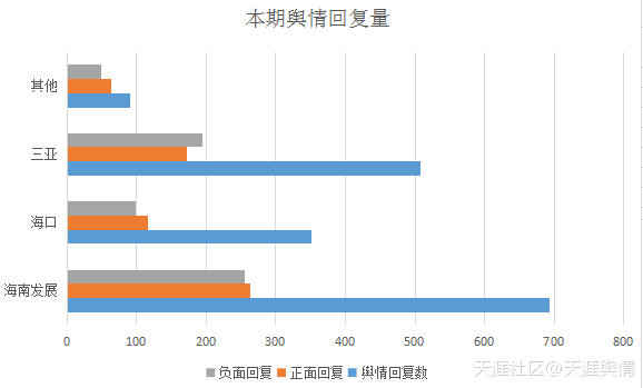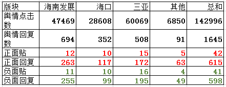 天涯舆情中心对天涯论坛海南相关版块具有明显正负情绪的舆情主帖进行了统计,分析得出,本周期各版块舆情点击量和舆情回复量较上周有明显下降,但三亚版因为旅游周期和冬季候鸟周期的提前到来,网友活跃度并没有减弱,舆情点季度超过海南发展和海口版越居榜首;整体天涯论坛海南板块的舆论情绪正负占比基本相同,无重大舆情事件及情绪体现。
