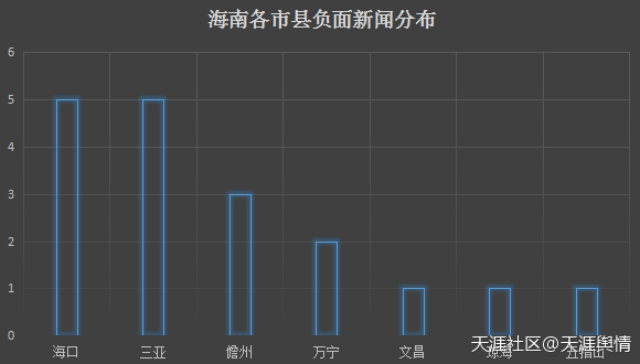 从分布图分析,海口、三亚因人口基数大和经济活跃,负面新闻数量较多,主要集中在民生、交通和公共治安新闻方面。