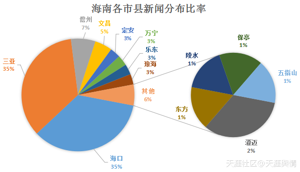 从海南各市县新闻分布图分析,海口和三亚占比明显,达到35%和35%。海口和三亚并列全省新闻比率榜首;三亚因为十一长假成为全国热点度假城市,新闻比率上升明显,并首次与海口并驾齐驱。