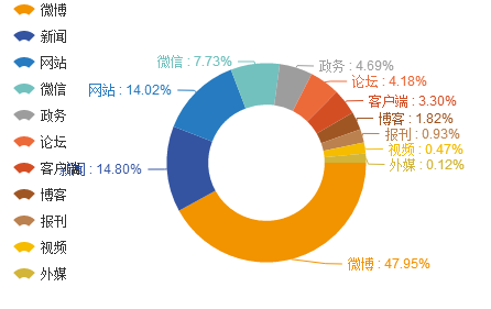 从舆情内容来源分析,微博占比据上周有小幅下跌,占比47.95%;媒体新闻和网站新闻略有上升,总共占比28.82%;微信占比小幅下跌,占比7.73%,其余来源的占比相较于微博、新闻和微信仍有差距。政务及客户端发力,均有小幅上扬。