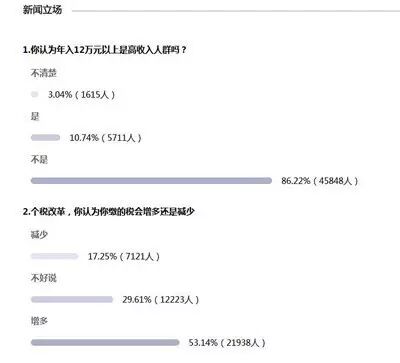 然而这样一个具有“良好初衷”的政策,却引来了网友“个税增多”的担忧。据腾讯今日话题的调查,“个税改革,你认为你缴的税会增多还是减少”的问题,53.15%(21928人)表示将增多,只有17.25%(7121人)表示会减少。而在问道“你认为年入12万元以上是高收入人群吗?”,有86.22%(45848人)表示“不是”,认为“是”的仅有10.74%(5711人)。