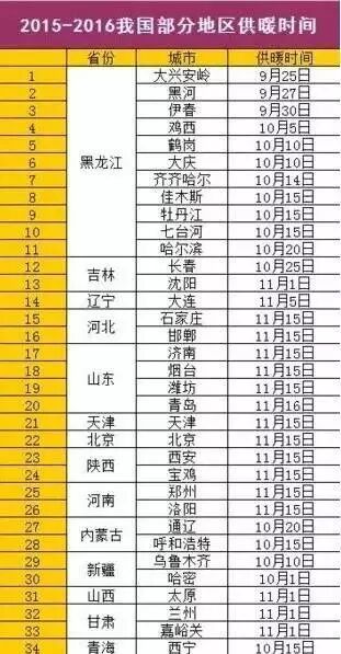 从2015年度的供暖时间安排来看,基本按照纬度由北向南增加,最早供暖的是黑龙江的大兴安岭市,9月25日就开始供暖,最晚是华北地区,基本在11月15日供暖,如没有特殊情况,一般情况不会变动。目前来看,受此次冷空气影响,多地已调整供暖起始时间,天津、太原、兰州、泰安等多地已开始供暖,烟台、海阳等表示“将根据天气变化调整供暖起止时间”。