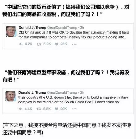 今天,特朗普又来了个“炮轰中国”第二波,在推特连发两条推文怼中国,指责中国操纵汇率、贸易保护及南海政策。“中国把他们的货币贬值了(导致美国的企业很难进行竞争),对我们出口的商品征收重税(但是美国却不对他们收税),问过我们了吗?”,“他们在南海建巨型军事设施,问过我们了吗?我觉得没有吧!”
