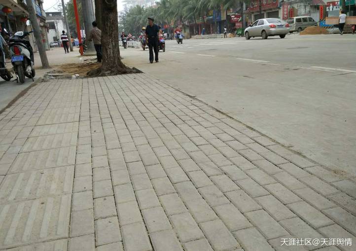 海口市内某地段设计不合理,机动车与人行道无明显分界,盲道中断。