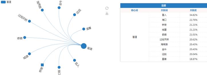 通过对与盲道相关的信息进行分析后可看出,与其核心词盲道关联度最高的词语为盲人(34.82%)、海口(22.76%)和桥墩(21.21%)。