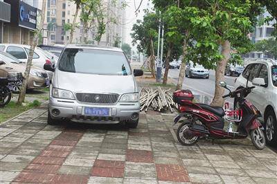 海口市大英山附近的一条盲道上停放着一辆车。