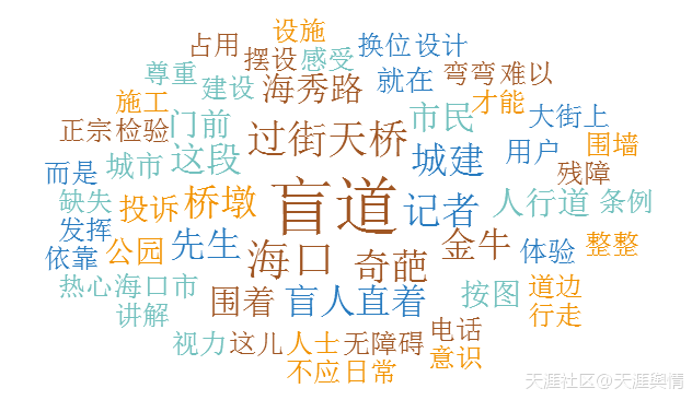 在本周期内与盲道相关的全部信息中, 被提及频次最高的词语分别为盲道、海口和过街天桥。