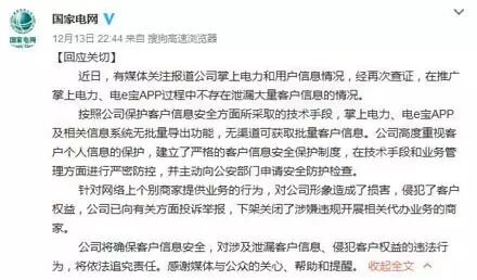 当日晚22:44分,@国家电网 通过微博回应关切,表示“不存在泄漏大量客户信息的情况”。指出掌上电力、电e宝APP及相关信息系统无批量导出功能,无渠道可获取批量客户信息。同时表示,对涉及泄漏客户信息、侵犯客户权益的违法行为,“将依法追究责任”。