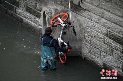 12月13日下午,成都市的工作人员冒着寒冬下水将一辆共享单车打捞上岸。据介绍,这是在某品牌的单车在入驻成都后,在不到一个月的时间里被第三次扔到河里的情况。