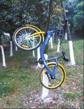 11月28日,在成都成渝立交地铁站旁,一辆共享单车被人挂在了树上,场面令人非常尴尬。