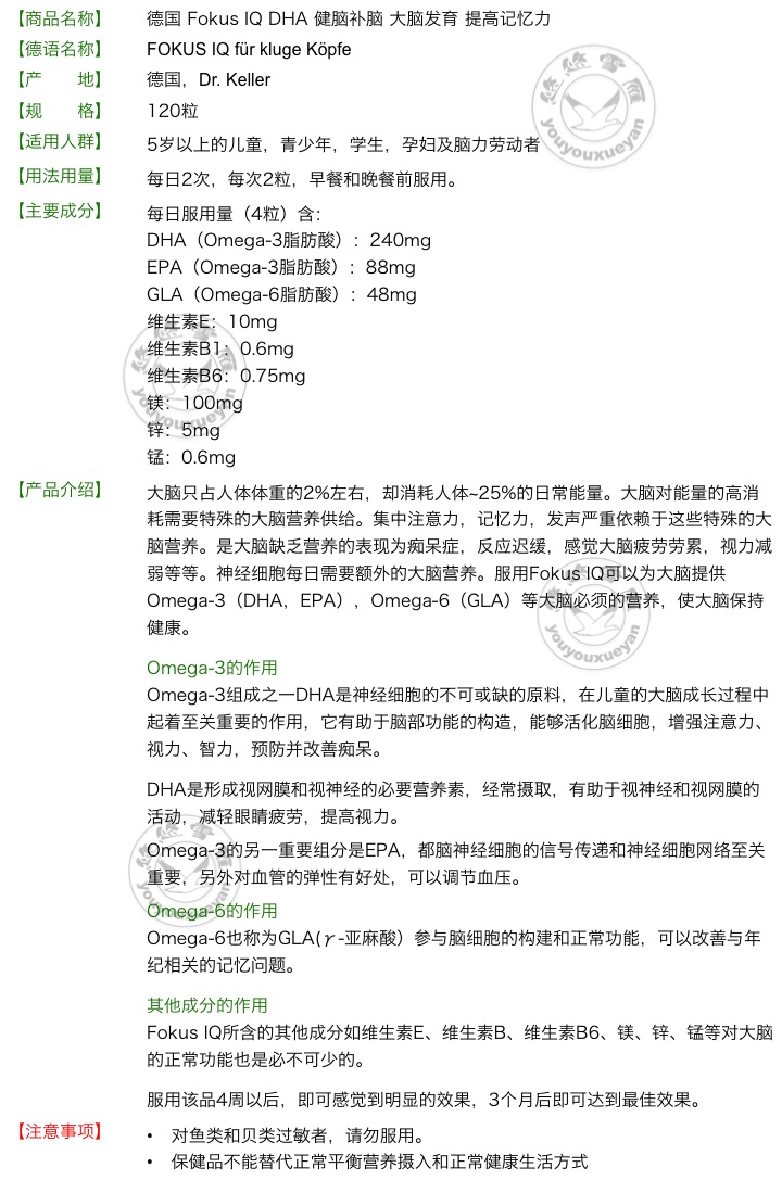 德国Fokus IQ DHA GLA 深海鱼油 大脑发育 提高记忆力