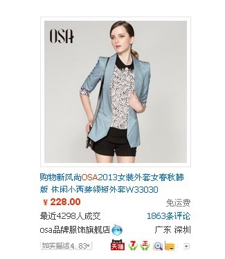 以OSA为例,“购物新风尚”是比较火热的活动,其实也是个热搜词汇。“OSA”品牌词,由于品牌影响力,“2013”时间点展现了发布时间。也代表了年份的款式,这服务了老顾客。“女装外套”这个词汇,其实我们也可以翻译成为“女式外套”,否则是不是把这个产品的一个款式属性确定了?他是一个开衫。“春秋”适合穿的季节时间点告诉了消费者。