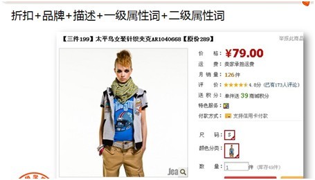 西装”“短外套”也就是说,这个短语也覆盖了很多的搜索信息。最后一组数字“W33030”是这个商品的货号。其中覆盖了现在的季节当中以下热搜词汇“购物新风尚”“韩版”“女装”“2013”“西装”“外套”等等热搜词汇。在这里,其实除了热搜之外,商品的基本属性表达的也很明确。这是大牌的做法,小卖家可以借鉴,但考虑到小卖家资金实力不够,所以在设置商品属性词时,可以从小处着手,不像他们那么覆盖广,力求覆盖精。