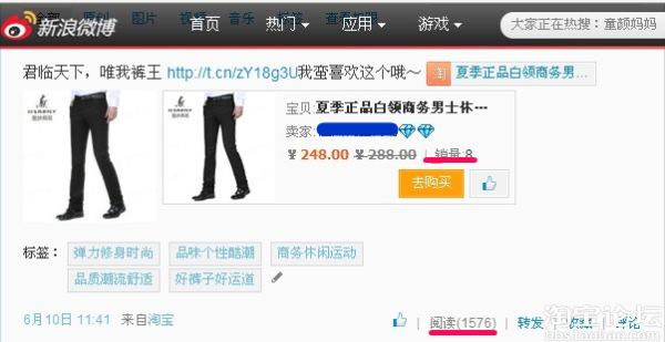 各位亲们可以从上图中看到,我们宝贝的阅读量均在1千流量以上。这种互动性很强、门槛又很低的微博确实产生了销售和效益。虽然,在交易的时候,我们并不知道客户来源从哪里来?但是,微博上很好的互动条件,能够帮助我们找到目标群潜在客户。