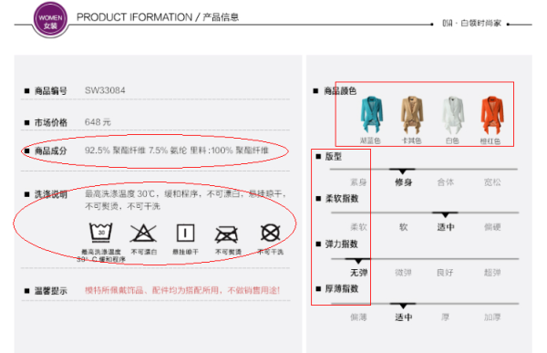 3、紧接着又给大家展示了产品的一系列数据,所展示的就是这款宝贝的,附件清单、型号尺码、颜色、成分等一些买家密切想知道的属性信息。