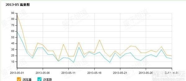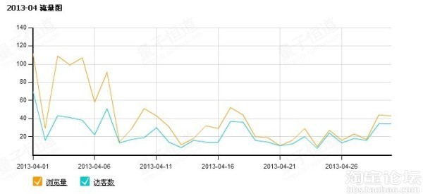 大家请看2013-03流量图,我的店是2月28号注册的店,后面然后上传了一款宝贝,只是一款,大家注意到流量了没,大约是在100左右,而且是很高的位置,当然出现峰值的时候是7天的一个上下架时间,那个时候流量最高。
