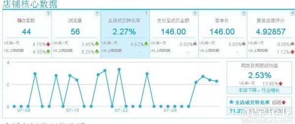 请看07月份的流量图,这是我发现问题后整改的图,当然主要操作是在7月份,我陆续的下架了被淘宝认为是不好的宝贝,当然这些宝贝质量都是很好的。然后重新上了3款新品,然后认真打造这3款新品,不幸的是这3款新品只有一款得到市场的回馈,然后我就开始把所有的精力放在一款产品上了,而这款商品,基本上每一两天会有一笔成交。