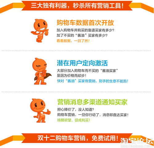 1:购物车营销:这个可能很多亲还都不知道,这是淘宝新增加的一个营销工具--购物车,是不是很多买家在逛淘宝的时候看到自己喜欢的宝贝就直接收藏或者直接加入自己的购物车,加入购物车的买家大都就是我们的潜在客户,如果这一部分的资源没有利用好是不是白白的流失掉了呢?http://a.tbcdn.cn/sys/wangwang/smiley/48x48/43.gif