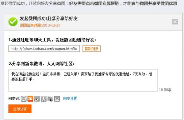 相比传统的团购形式,买家参与微团购的门槛非常低。买家只需要拉来一个好友购买,就能享受到您的专享优惠。这个好友可能是他/她的亲人,可能是他/她的情人,也可能是他/她的好哥们儿或者闺蜜……
