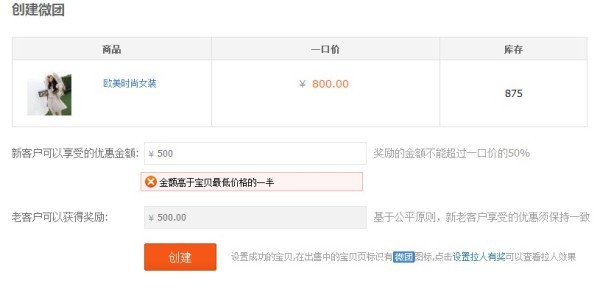 参团人享受的折扣是通过发放微团专用的宝贝优惠券的方式实现的,设置金额不能高于商品最低价格的一半。发起人返利金额与参团人优惠券金额一致,不需要填写。点击创建后,即可发布成功。