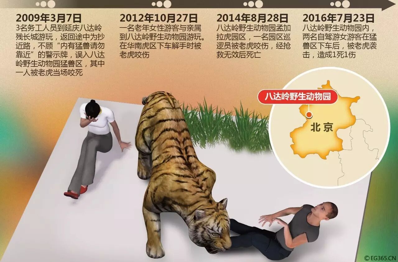 7月23日下午,在北京八达岭野生动物园东北虎园内,发生了一起老虎伤人事件,游客在自驾车过程中,私自下车受到老虎攻击,最终造成1死1伤。事件发生后,北京延庆区组织救治伤员,并成立了调查组,责令北京八达岭野生动物园立即停业配合调查。目前,伤者经过治疗已脱离生命危险,伤情稳定,但全身多处撕裂伤。