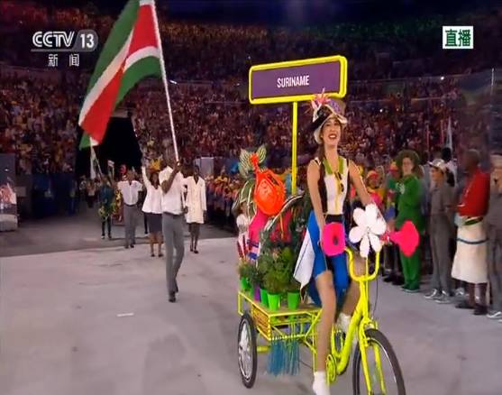 “里约奥运会开幕式创造了一个非常独特的礼仪小姐的入场仪式。过去我们习惯的是一个漂亮的礼仪小姐举着各个国家的牌子,而在里约是骑着一个三轮车。估计北京奥组委看到里约奥运会的这个创意,会觉得,这应该是我们的吧?”