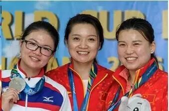 △2016年3月3日,2016年射击世界杯分站赛第一站比赛在泰国曼谷举行,张梦雪获得女子10米气手枪项目第三名。(右一为张梦雪)