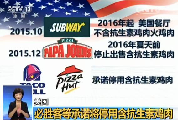 在美国,很多快餐巨头陆续加入到停用抗生素的行列中。去年10月,赛百味宣布从今年开始在其美国餐厅供应不含抗生素的鸡肉和火鸡肉。去年12月,棒约翰宣布在今年夏天前停止出售使用过抗生素的鸡肉。百盛集团旗下的两个快餐品牌——塔可钟和必胜客也已承诺将2017年作为停用含抗生素鸡肉的最后期限。