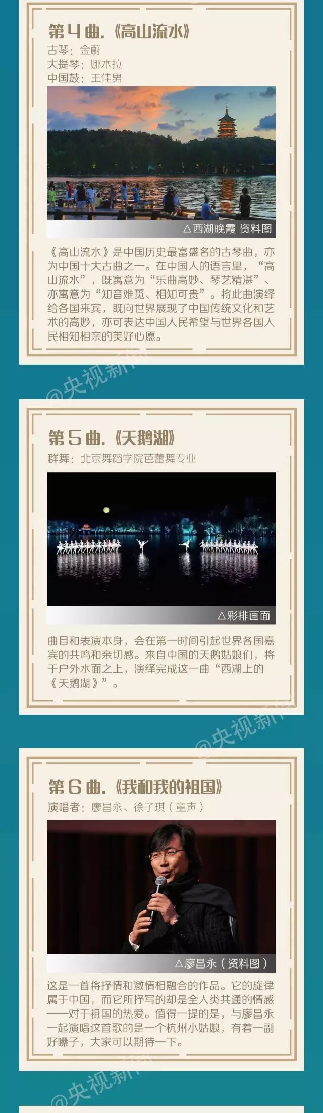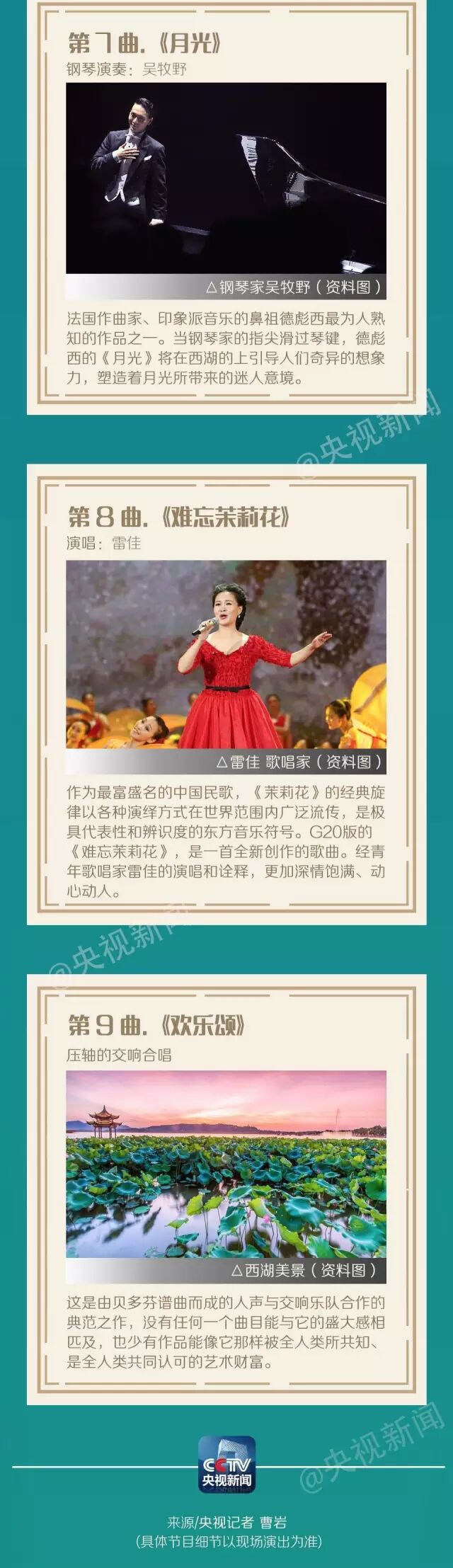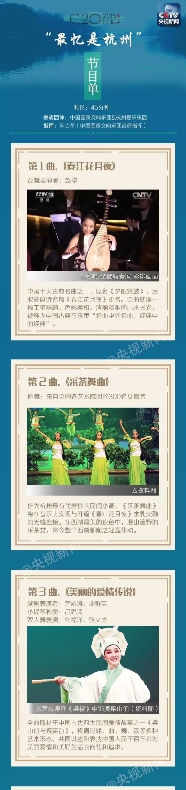 张艺谋接受央视采访时“剧透”了明晚G20峰会文艺演出的风格,他将这台演出定义为“实景演出的交响音乐会”——国内首次在户外的水上舞台举办大型交响音乐会,一共9个节目,总时长45分钟。