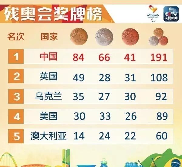 正在巴西里约热内卢举行的残奥会中,中国军团继续领跑奖牌榜。目前,中国累计获84金66银41铜,共191枚奖牌,暂列金牌榜、奖牌榜第一。