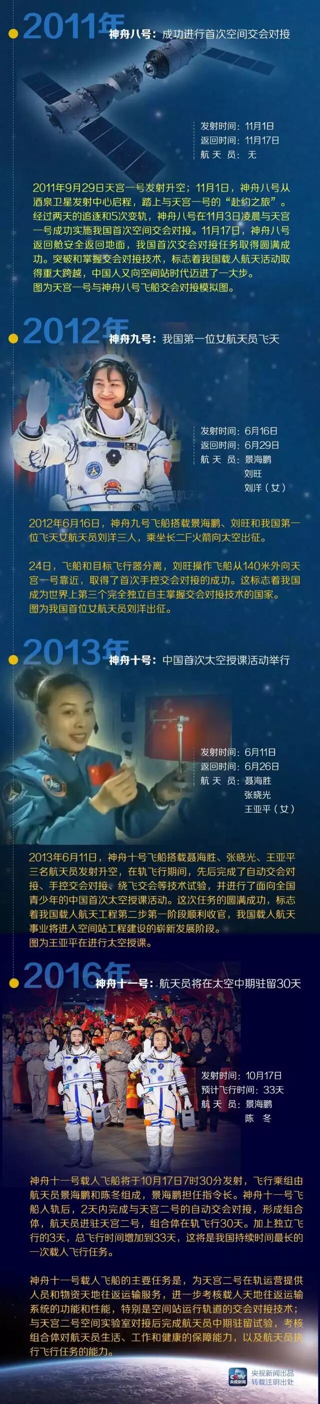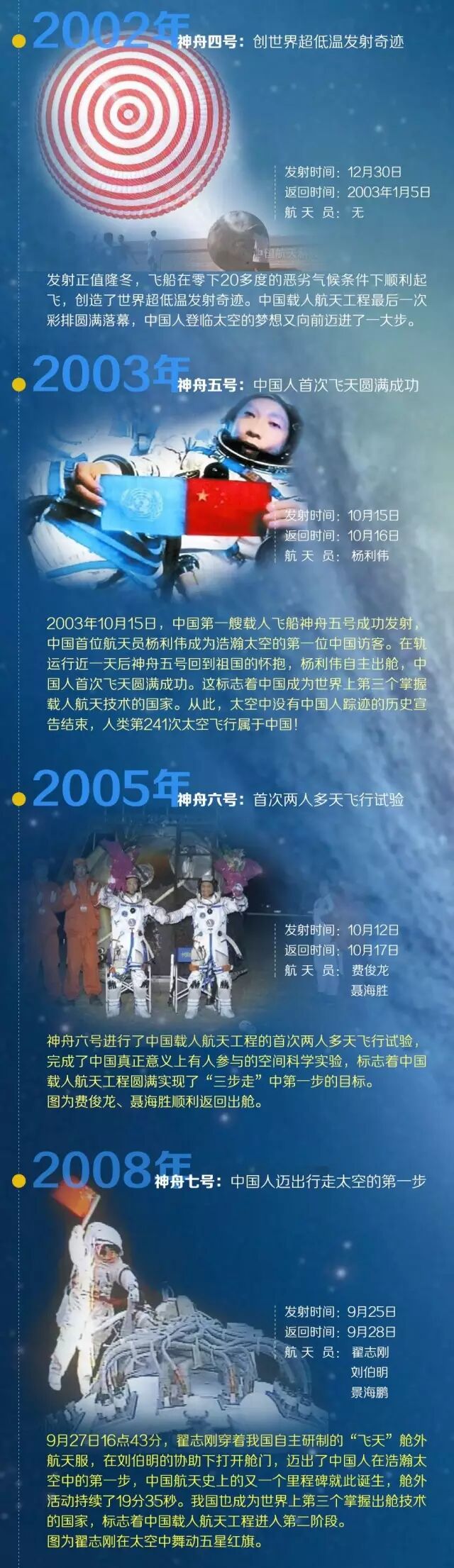 1992年,中国载人航天工程正式立项,从1999年神舟一号发射成功到2013年神舟十号任务圆满完成实现“十全十美”,载人航天取得了一个又一个成功——从无人飞行到载人飞行,从一人一天到多人多天,从单船飞行到组合体稳定运行,并突破了载人天地往返、太空出舱、空间交会对接等关键技术……