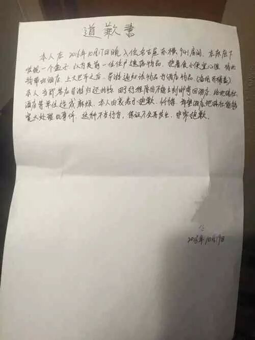 由于自己的行为给旅行社、酒店造成的麻烦,游客李某写了道歉书,信中表示由衷地抱歉、忏悔。