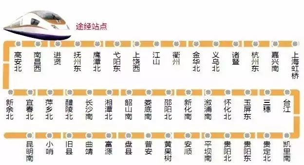届时按350公里/小时的设计时速计算,从昆明到长沙仅需4小时,昆明到杭州8小时;从上海坐火车前往昆明,最快只要10个小时!比现有的沪昆铁路节省将近27个小时。而宁波人想去昆明旅游,可以先到杭州,然后坐动车直达昆明,所花时间也将大大缩短。