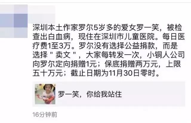 近日,一篇名为《罗一笑,你给我站住》的文章刷爆朋友圈。文章作者罗尔称,由于女儿身患白血病,他和一家公司商定,自己写的文章转发一次,公司就会为他女儿捐赠1元钱。连日来这篇文章被众多网友“疯狂”转发。