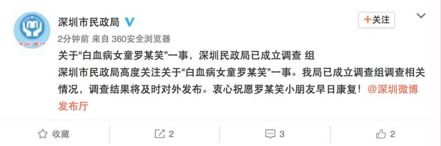 此次事件之所以在网络上引发了热议,是因为不少网友认为,自己的同情心被消费了,而营销机构却“涨了粉”。深圳市民政局表示,高度关注关于“白血病女童罗某笑”一事,其官方微博发布,已成立调查组调查相关情况,调查结果将及时对外发布。