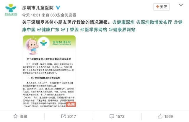 医院在通报中称,罗尔的女儿5岁11个月,于2016年9月在深圳市儿童医院血液肿瘤科确诊急性淋巴细胞白血病,2016年9月、10月、11月三次入院接受化疗。11月7日入院后,在治疗期间患儿出现发热、气促、心率快,黄疸逐渐加重等感染征象,于11月23日转入重症医学科。