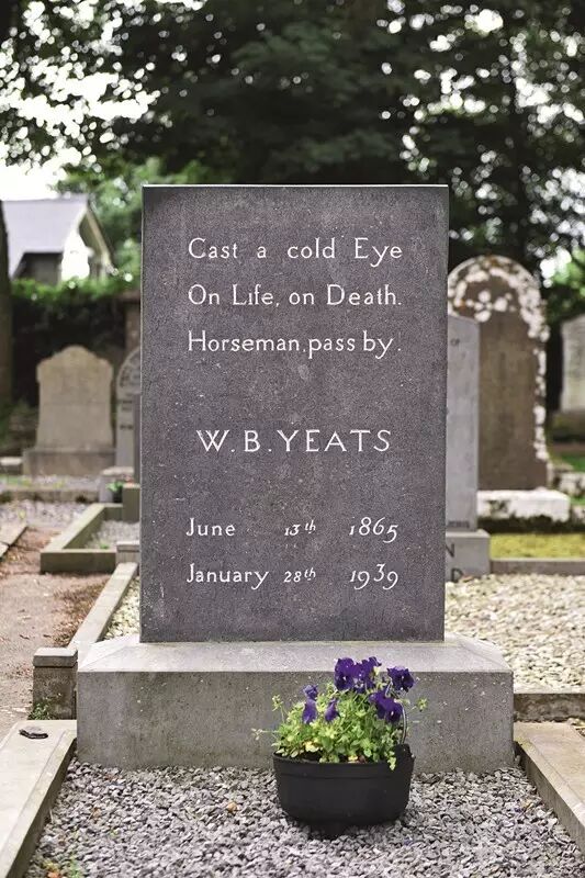 1939年,叶芝在法国逝世。遵照遗愿,1948年他的遗体被送回故乡斯莱戈,墓碑上刻着晚年作品《本布尔宾山下》的最后一句——冷眼一瞥 / 生与死 / 骑者 / 且前行。