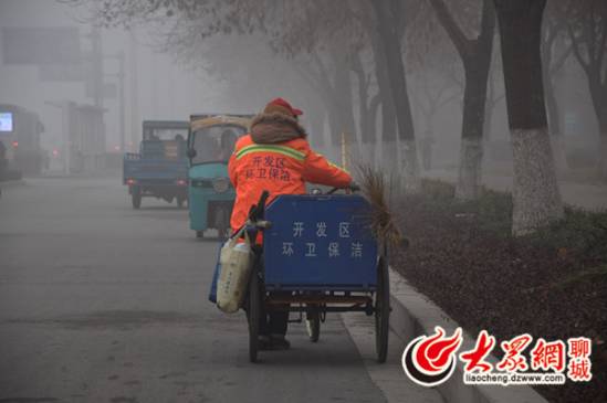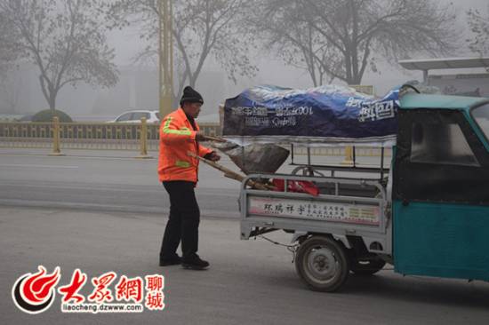 20日下午,山东聊城开发区东昌路段,雾霾天里环卫工人正在清扫路面垃圾。