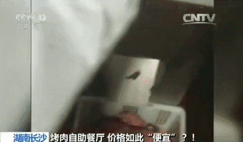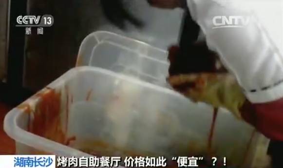 可是这家烤肉店,不仅让客人把拿走后,又不吃的肉重新放回到餐台上,店里的工作人员更是把前一天晚上客人吃剩下的“口水肉”,也重新摆放到柜台中,供人挑选。这些肉并没有经过任何冷冻,经过一晚上的放置,肉品有些发黑。