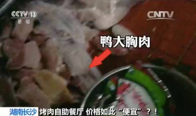 在这家烤肉店的餐台上,摆放着牛肉、羊肉等多种菜品,牛肉通常是客人的首选。可这牛肉竟然是鸭肉冒充的!