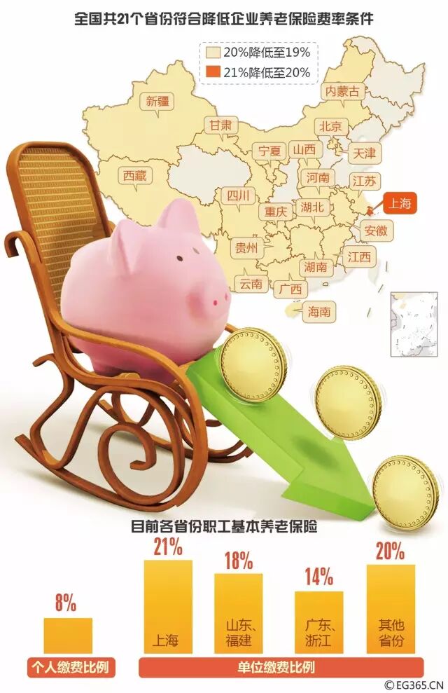 人社部新闻发言人李忠透露,全国有21个省区市符合降低企业养老保险费率条件。有媒体梳理发现,截至目前,至少已有北京、上海、天津、重庆、四川、安徽、江西、新疆、山西、河南、湖北、广西、贵州、湖南、甘肃、宁夏、江苏、海南、云南等19个省区市宣布下调了企业养老保险费率。其中,上海由21%降至20%,其余省份均由20%降低至19%。