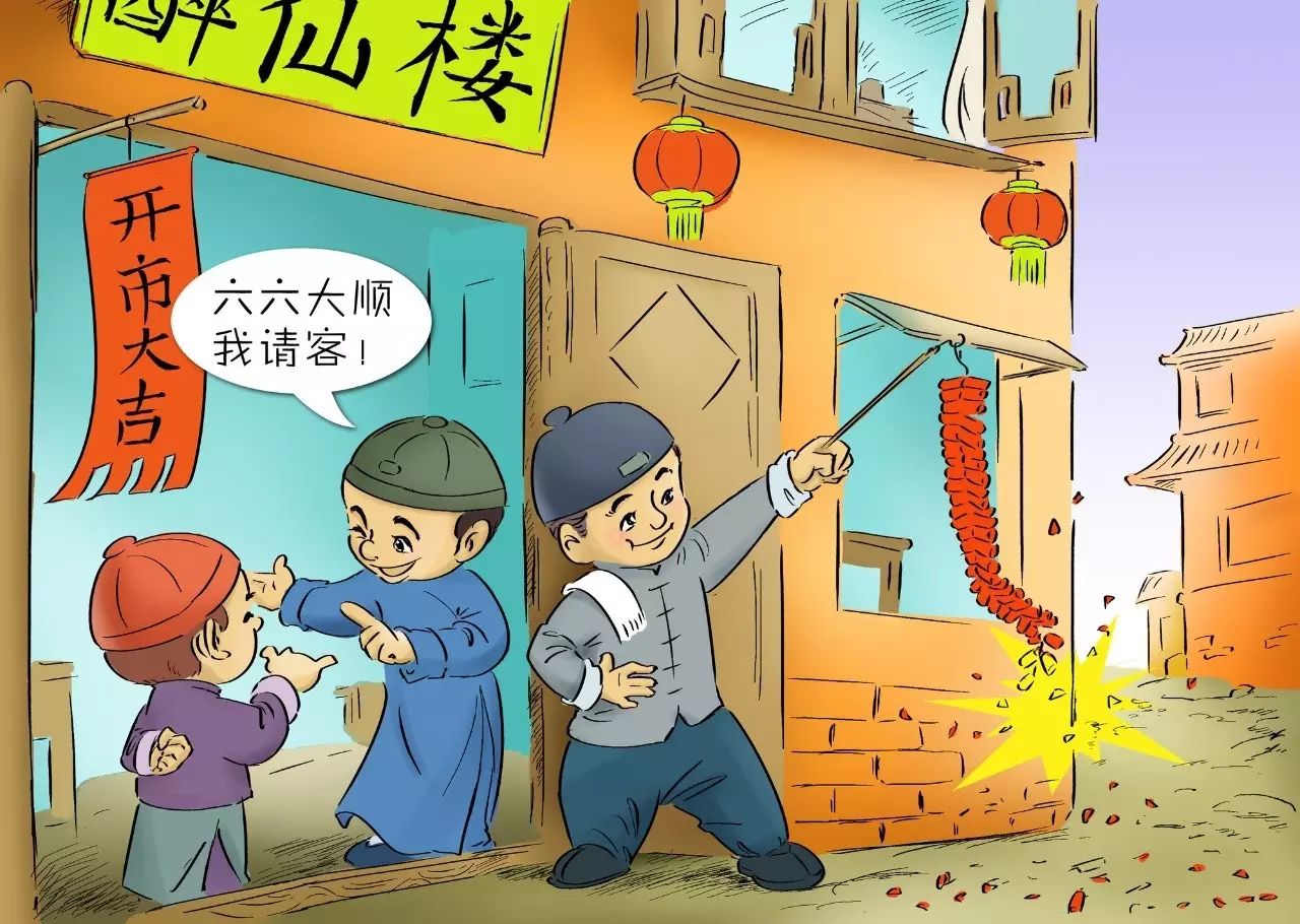 这时,鞭炮齐鸣,伙计们都猛劲地摇算盘,用秤杆敲打秤盘,屋里屋外响成一片,谓之“响响当当,大吉大利”。这时便有乞丐们来唱“喜歌”,掌柜的少不得要赏他们几个“喜钱”。在祝福的气氛中,店铺打开了护窗板,露出了早已贴好的“开市大吉,万事亨通”的红对联,正式营业。