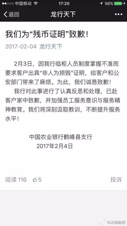 银行方面为“奇葩残币证明”致歉